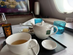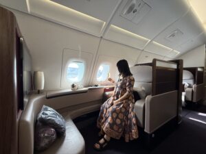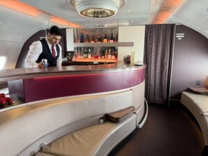 上記の写真はカタール航空ですが、ファーストクラス搭乗者は空港でジャグジーに入れたり、専用車が迎えに来てくれ、レストランのようなラウンジではフルコースのお食事が楽しめたり。